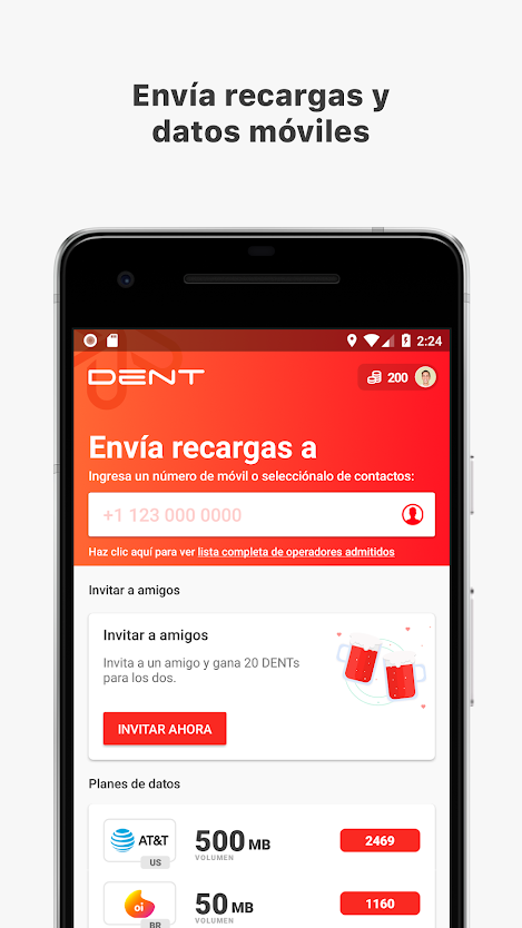 EnvÃa recarga de datos móviles y gana datos gratis con la aplicación Dent. Obtiene recarga de datos móviles y recarga de saldo o minutos para teléfonos inteligentes en México, Estados Unidos, Guatemala, España...etc. La aplicación Dent te permite recargar tu teléfono o el de otra persona, independientemente de donde te encuentres en el mundo totalmente gratis. Con la aplicación Dent tu puedes recargar tu teléfono o el teléfono de personas queridas desde cualquier lugar del mundo gracias a la app Dent. Para ello, necesitas descargar la aplicacion del link que se encuentra mas abajo en esta pagina. Cuando la instalamos, posteriormente la abrimos, nos pedira ingresar nuestro numero de telefono, nos llamaran y nos diran el codigo de verificacion, o bien, podemos elegir que nos manden el codigo via SMS. Una vez recibido el codigo, lo colocamos en la casilla vacia y le damos en la flecha para realizar el siguiente paso. Ahora tras poner el codigo que nos llega al telefono que hemos puesto, nos van ha pedir registrarnos en la aplicacione mediante nuestro perfil de Facebook o nuestro Gmail, si tienes otro correo (por ejemplo Outlook.com o Yahoo.com), eliges la ultima opcion y pones tu correo electronico a mano. Y asi ya tenemos una cuenta en la aplicacion Dent. Al registrarnos nos regala Dent unos puntos, nos regala 420 Dent's (puntos o monedas).